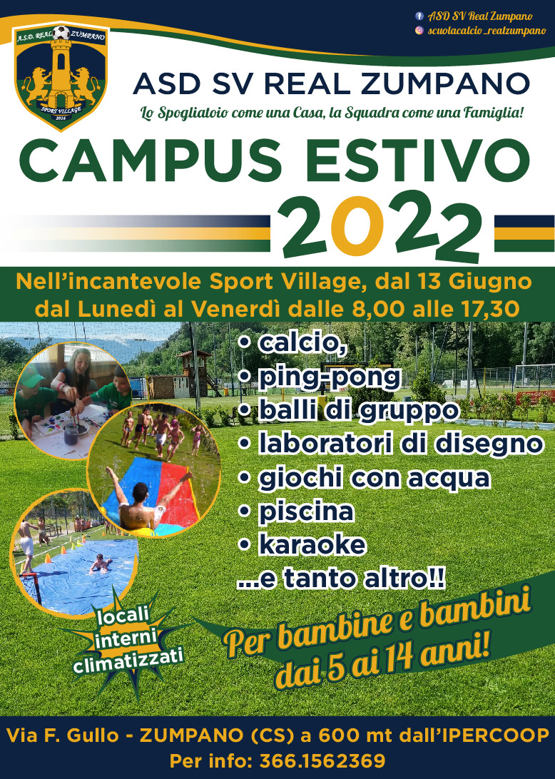 Il Campus estivo promosso dall’Associazione Sportiva Dilettantistica Sport Village Real Zumpano, si svolgerà presso lo splendido Sport Village Carmine Carbone, con la presenza di collaboratrici e collaboratori qualificati.